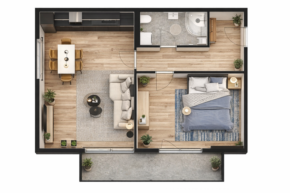 Byt má celkovou plochu 58,2 m² (byt 48,8 m², dva balkony o ploše 6,6 m², sklep 2,8 m²) a bude připraven k nastěhování na začátku roku 2027.